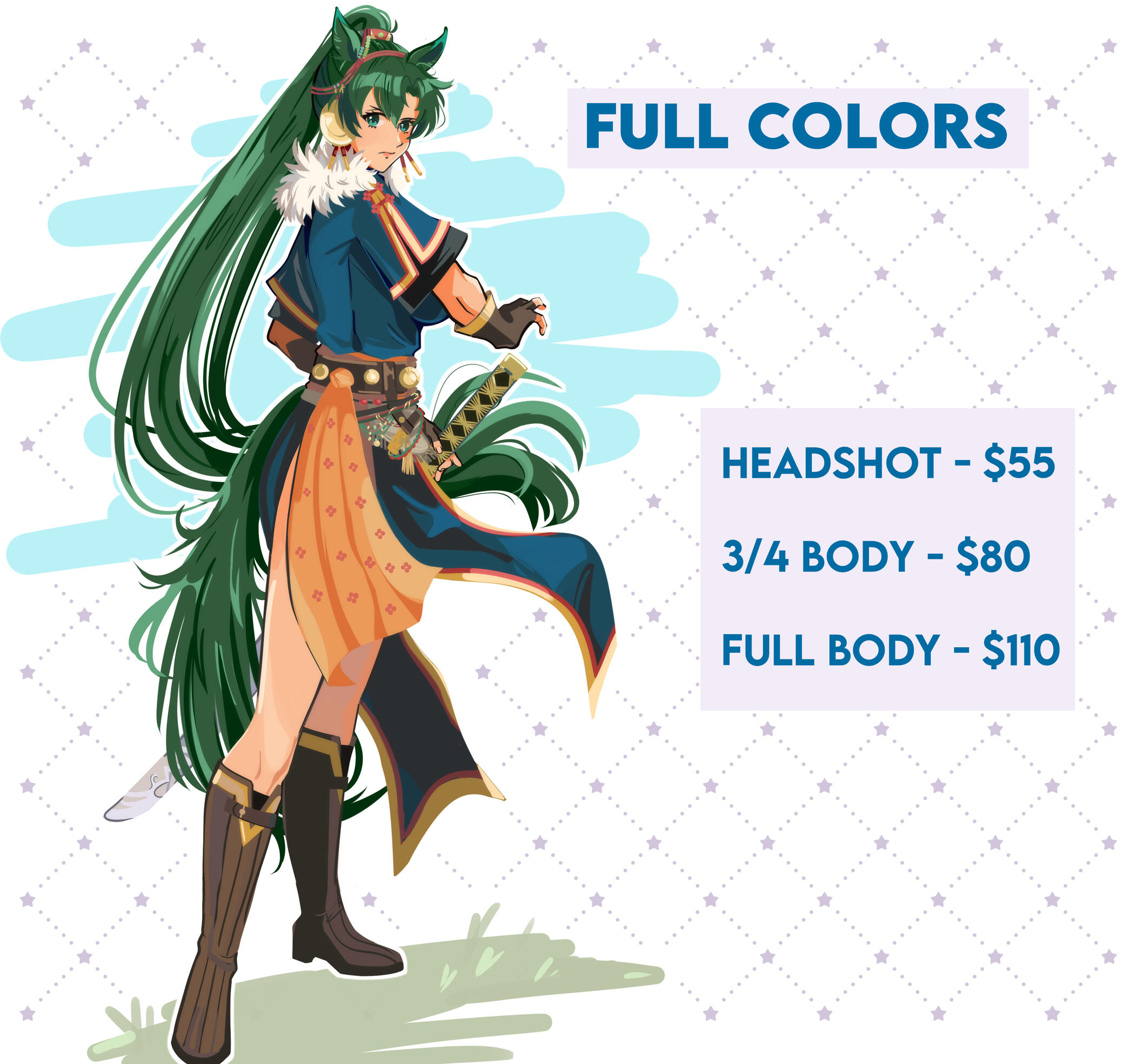 I won't start the commission until I receive full payment. I don't give refunds after the commission has been started. (Unless for some reason I won't be able to complete it.) I only accept payments in USD and I only use invoices.Rights and Licenses